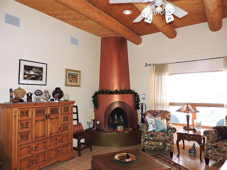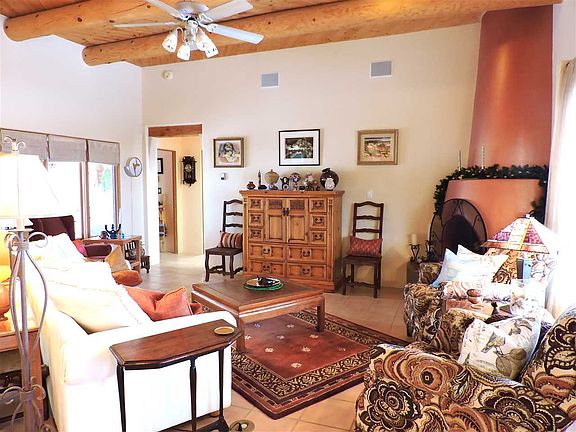 First time on the market, one owner custom home in Eldorado. Lovely soft lines and Santa Fe finishes in this charmingly cozy open plan, split 3 bedroom design by Homes by Marie. Radiant natural gas heat, kiva fireplace and viga ceiling in living room, tile floors throughout, large sunny kitchen with breakfast nook and a walk in shower in master bath. There is an oversized 2 car garage and lovely walled gardens with a fabulous sunset mountain view. All close to local shopping an Eldorado community amenities as well as a 62 acre greenbelt.