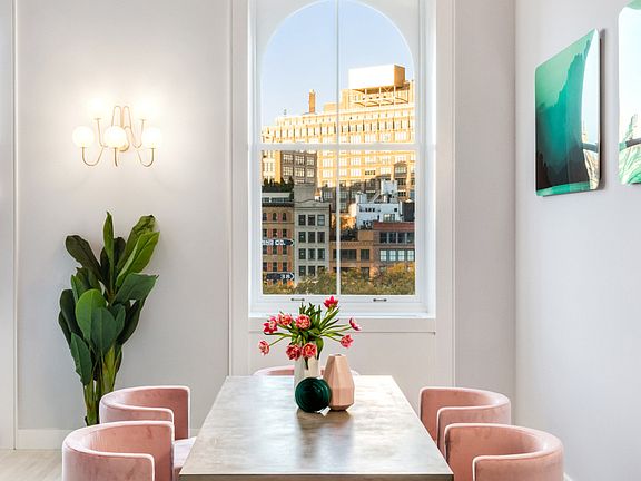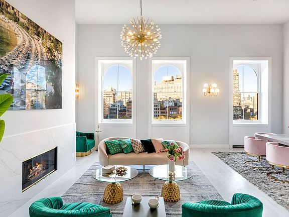 This one-of-a-kind, mint-condition loft is located on coveted North Moore Street, in the sweetest spot of prime Tribeca. The architecturally dramatic residence with over 4,100 square feet, boasts a Great Room of impressive scale with a spectacular 16-foot high ceiling, a wood-burning fireplace and massive arched windows that draw light throughout the apartment and provide stunning city views. This 4 bedroom, 4 bathroom turnkey loft, spread over 3 floors, was custom designed to maximize living possibilities through an open floor plan concept that affords the lucky owner with many options for living and working from home. As part of the extensive gut renovation, every inch of wall space was also skim coated to showcase art and collectibles. The result is a strikingly luxurious and contemporary space housed within the iconic walls of the Merchants House condominium. As you enter the impressive living area, you will be instantly captivated by the full scale and openness of the loft: a 26' by 20' chef's kitchen and media lounge that leads to an even grander entertainment and dining space with double height ceilings flooded with sunlight. The luxurious chef's kitchen features a massive 15 feet waterfall island for cooking and entertaining, and is equipped with state of the art appliances including Viking stove, Subzero fridge, Miele Dishwasher and Dornbracht fixtures. The island and countertops are Calacatta veined Chateau Marmont natural quartz, one of the hardest and most durable stones in the market. The main floor also features a generous laundry room with a newly appointed full-size washer and dryer with Pietro Cardozo countertops. A flight of steps up from the main floor leads you to the luxurious primary bedroom suite, a private oasis with a large dressing area and sumptuous bath tastefully appointed with mosaic Calacatta marble and glass tiles, a soaking tub, double vanity and rain shower. There are two additional bedrooms on this level that share a beautifully designed bathroom. There is a fourth private bedroom suite on the lower level of the triplex with its own bath and expansive walk-in closet. This terrific space can be used as a primary bedroom suite or as a private oasis ideal as a home office. Additional features of this residence include beautiful hardwood floors, central AC, recessed and wall-mounted lighting and incredible storage throughout. Located in the boutique Merchants House Condominium, this stunning residence boasts a location second to none in the heart of historic Tribeca with its cobblestone streets lined with trendy boutiques and restaurants. It is only minutes from Hudson River Park and the best of downtown living. The Merchant's House is one of Tribeca's most sought after boutique condominiums where lofts rarely change hands. Residents at the Merchant's House enjoy Virtual Doorman, video intercom system and key-locked elevator. Garage parking is available in the building. Pets are welcome.