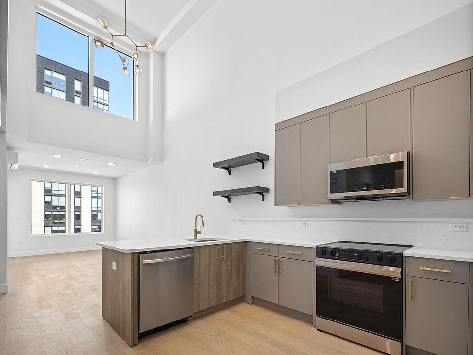 Each home has been curated with precision, blending modern elegance with everyday comfort. Kitchens feature sleek Samsung appliances, striking quartz countertops—including MSI Soapstone Metropolis and veined white finishes—paired with bold brass hardware and faucets. Select layouts also offer open wall shelving for a warm, personalized feel. Bathrooms are equally refined with matte black fixtures, porcelain tile, and reeded glass shower panels in the primary suites—balancing sleek design with inviting texture and tone. Expansive windows, engineered wood flooring, solid core doors, smart entry systems, and in-unit laundry round out a living experience rooted in style and function.