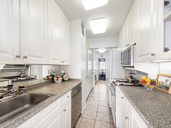Enter into an oversized gallery surrounded by three generous closets and be drawn immediately into a massive living room with a wall of windows drawing in warm sunlight from the West, directly over Park Avenue and its verdant meridians. The living room pours into an adjacent windowed dining area, allowing for flexibility when hosting large dinner parties or holiday gatherings. The kitchen is just next to the dining area behind a pair of twin doors to discreetly close off the space when entertaining. The kitchen has excellent storage and counter space, enhanced by custom cabinetry with counter lighting and a pantry. There is a refrigerator/freezer, a gas stove with convection oven as well as a full-sized stainless steel dishwasher.