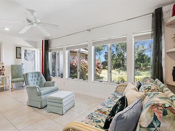 Spectacular Home in Grenelefe Estates with Private Courtyard and Golf Cart Garage Nestled in the peaceful Grenelefe Estates, this charming 2-bedroom, 2-bath home sits on a quiet corner lot, tucked behind lush, meticulously trimmed landscaping. Enter through a side iron gate into your private courtyard, your personal outdoor sanctuary. Inside, the entire living area is adorned with oversized porcelain tile (no carpet), creating a seamless, wide-open space. The UPDATED kitchen shines with quartz countertops, a stainless sink, a tasteful backsplash, cabinet roll-outs, a double trash receptacle, three Lazy Susans, and new hardware. Dark stainless Samsung appliances. The primary suite is spacious enough for a king bed and dressers, with nearly floor-to-ceiling windows that flood the room with natural light. The en-suite features double sinks, a trimmed mirror, and a remodeled shower with two shower heads and a built-in shampoo shelf. Ample closets provide generous storage. Beyond the living area, you'll find a very large pantry, and the laundry sink sits in the garage for added convenience. A standout feature is the AIR-CONDITIONED BONUS ROOM/FLEX SPACE behind newly installed locked French doors, ideal for a home office, den, reading nook, or guest space. Community features include a heated community pool and very low yearly HOA dues. Come see it today!