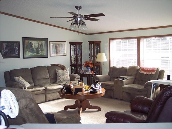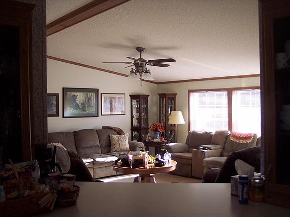 Spacious 2001 28x64 Rebman Shadowridge. Move in ready! Newer carpet, vinyl floor in foyer, & master bath & newer furnace in 2011 are just a few of the many upgrades. Stone fireplace w-built-in cabinets in living room. Fireplace is wood burning & perfect for those cold nights. HMS warranty included.