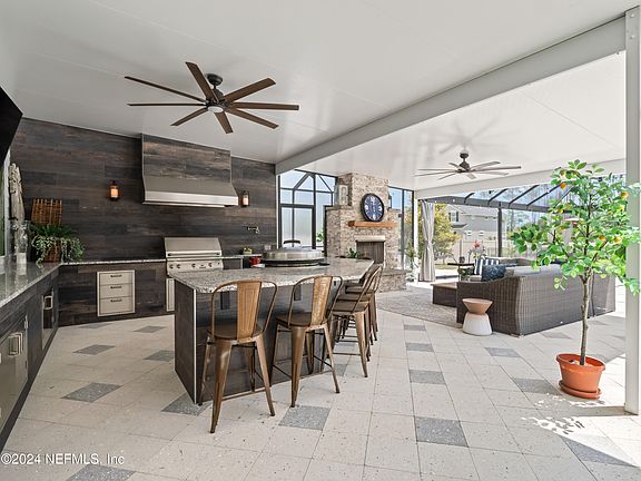 Outdoors, the screened lanai and summer kitchen with EVO griddle, gas cooktop, and granite island are perfect for entertaining. Relax in the swim spa, enjoy the jetted Jacuzzi, or gather by the stone fireplace in your private backyard with breathtaking marsh views.