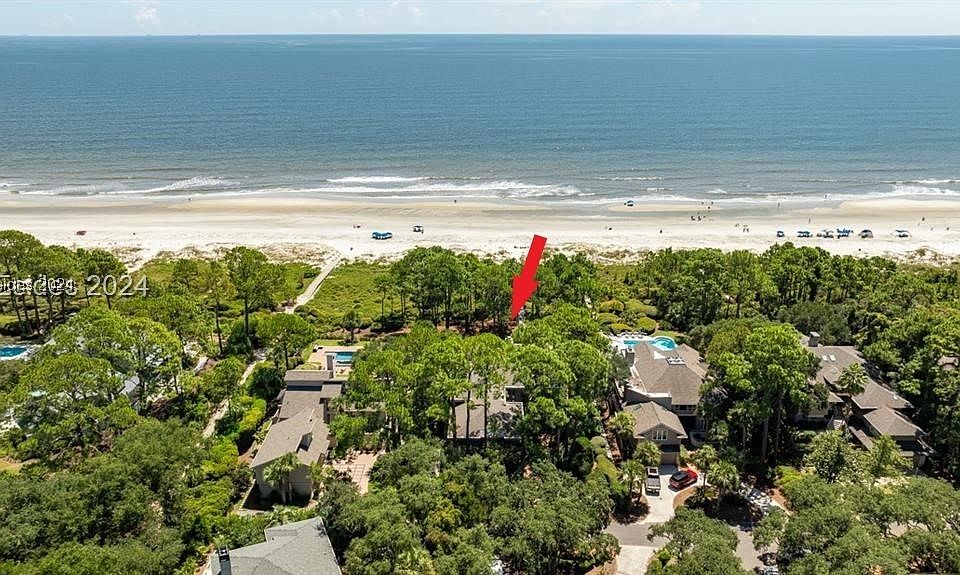 Breathtaking ocean views from this classic Sea Pines 5 bed/7 bath oceanfront home. Built by high-end builder Johnson-Delaney and designed by renowned architect Peter Brower, this superior quality home has been meticulously maintained and never rented. 2nd floor great room has cathedral ceilings that give plenty of natural light. Large gourmet kitchen with Viking stove. 2 fireplaces and a screened porch. Spacious primary suite with adjacent office. Elevator stops on 3 levels. 2-car garage. 2nd primary suite on first floor. Privacy is assured with landscaping surrounding pool/spa and secluded walkway to the beach.