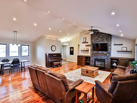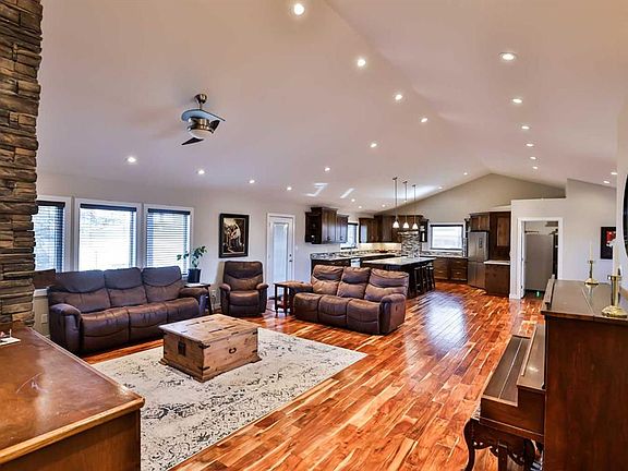 Welcome to this stunning, custom built, sprawling bungalow. This home truly has it all, no detail was overlooked! Through the front door you are greeted with vaulted ceilings, and a large open foyer that sets the tone for the whole home. In to the living room with a beautiful gas fireplace with rock detail and custom built ins on either side. The open floorplan flows in to a dreamy kitchen, with a positively massive island with granite countertops, and custom cabinetry all around. There’s extra drawers, a built in desk, and more cabinets than you could ever hope for! The whole family could eat at the island! Two large windows in the kitchen flood this space with plenty of natural light. You will love spending time and gathering here. One of the best parts about this place is the huge pantry just off the kitchen. It is a mom’s dream!! Just off the door in from the attached double garage is a great mudroom with a built in bench and hooks, and a fantastic size laundry room that has it all! More custom cabinets, and even built ins for laundry baskets, plus plenty of counter space for folding. This is only one side of the main floor! The other side hosts the half bath, an office, and the primary suite. The primary is exceptional with its large size, a walk in closet, double sinks, and the best part?! A custom steam shower with double shower heads and a built in bench. The basement is just the perfect family/host scenario. A massive family room with a wood burning fireplace, three great size bedrooms plus a gym, a large bathroom, and more storage space than you’ll ever know what to do with! This home is perfectly set up and ready for your family to move in to. We haven’t even got to the outside yet! The big backyard features a covered deck, hot tub, gardening space, a hot tub(!!), and we can’t forget the 23’x35’ detached workshop that also has a wood burning stove. That’s right, a double attached garage and a huge detached shop, plus off street parking for days! Located on a nice wide street, super close to all of Raymond’s great amenities, this home truly is a must see. Your kids could walk to the swimming pool, any of the schools, parks, the grocery store, and so much more. Give your REALTOR® a call and come see all this place has to offer!