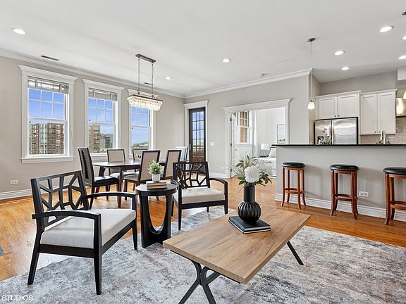 Stunning 3-bedroom, 2-bathroom penthouse condo in the heart of Chicago's West Loop! This meticulously maintained top-floor unit blends sophisticated craftsmanship with modern updates. The home features oak hardwood floors throughout, high ceilings adorned with custom trim and crown molding, and an updated kitchen with sleek white cabinetry, granite countertops, and stainless-steel appliances. The extra-wide living and dining area flows seamlessly onto a private balcony with unobstructed south and east facing city views! Cozy up by the gas fireplace in the living room, where you can soak in stunning city views from the comfort of your sofa. The expansive master suite accommodates an oversized bed and boasts a fully built-out walk-in closet and a spa-inspired ensuite bathroom with a dual vanity, jetted tub, and large separate shower. The second bedroom is appointed with fully built-out closets. And the third bedroom, accented by elegant double French doors, serves as an ideal home office or guest room. Head up to your large private section of the roof deck with panoramic vistas of the iconic Chicago skyline-an ideal retreat for relaxation or hosting guests. Located steps from the West Loop's vibrant amenities-parks, dog parks, top-tier restaurants, shopping, and nightlife-this condo is also around the corner from the highly regarded Skinner Elementary School and Skinner Park. The property includes a heated indoor parking space with ample space for additional storage. Schedule a showing today to experience this exceptional home!