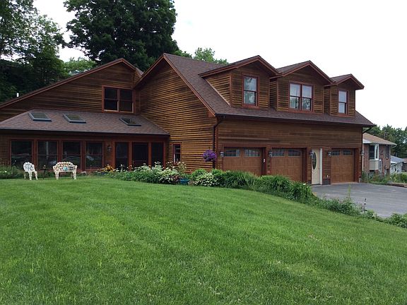 Beautiful custom home with many aesthetic details throughout. Abundant light from the many skylights plays off the gleaming wood floors, soaring ceilings and granite surfaces. High end appliances in the large eat-in kitchen, solarium/dining room with southern exposure, hot tub and sauna room. Comfortable 2nd floor apartment over the garage with balcony, private entrance & garage. Lovely private backyard features a fish pond, rock garden and adorable shed. Taxes reflect old assessment of $375,000. Projected taxes based on $275,000 assessment should be about $7,315.