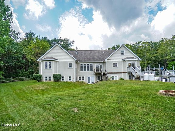 Custom, spacious 6 bedroom, 4 1/2 bath house tucked away on a 7.31 acres, private lot with almost 5000 SF of finished living space on three levels. Perfect for entertaining, this home features a dramatic 2 story Great Room with stone fireplace open to an eat-in kitchen with island and SS appliances plus a formal dining room. The first floor primary suite has cathedral ceilings, custom tile shower & bath with jets 2 other bedrooms and bath on first floor. Second floor loft plus 3 bedrooms or large play room and a bath. Radiant heating throughout. Finished 9' ceiling walk-out basement with multiple rooms and full bath plu