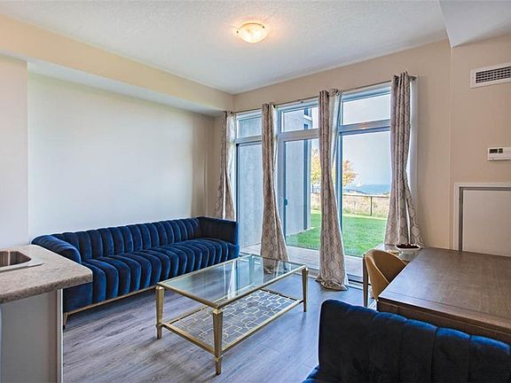 WATERFRONT CONDO! Main floor apartment in Waterfront Trails Building. 1 Bedroom, 4PC bath, eat-in kitchen with stainless steel appliances & in-suite laundry. Walkout from living room to private waterfront patio with views of Lake Ontario. Rooftop, party room, bicycle storage. Efficient geothermal HVAC allows for low monthly costs.