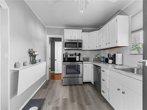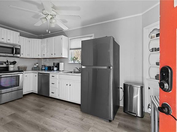 Charming, updated cape home with 2+ beds and 2 full bathrooms. Surprisingly spacious with 3 floors of living area, this property welcomes you with quiet comfort. A convenient side entrance into the cozy kitchen offers stainless appliances, built-in shelves and tile flooring. Also on the main floor is a cozy living room with a wood fireplace, more built-in shelves and warm hardwood floors that extend to the two downstairs bedrooms. A full bath with a new shower/tub and pretty tile round out the amenities. The second floor is waiting for you to enjoy as a TV room, office area or workout space! Skylights keep this space bright and new carpeting underfoot. The partially finished basement has a large room with windows and a sliding patio door leading to a mudroom/entryway. Downstairs is a washer and dryer neatly tucked behind double bi-fold doors and a bathroom with a large, tiled shower with two showerheads and a built-in bench seat. The sliding door in the main room leads to the two parking spaces located around back. Outside you will find a relaxing retreat with a tidy patio, a covered seating area, a gardening shed and lush arborvitae's offering privacy. With a newer roof & water heater, updated 1st floor bathroom, new carpeting and paint, this home offers style, function and a place you’ll be proud to call your own. Sold “As Is” and subject to seller finding suitable housing.
