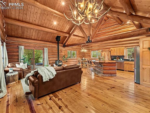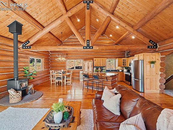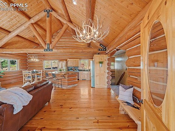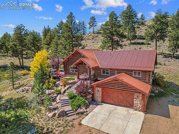 Welcome to your dream mountain getaway! 3 BR, 3 BA, 2,942 SF log home on 20 pristine acres in the serene landscape of Lake George, CO. Conveniently located 6 minutes from Highway 24, it strikes the perfect balance between accessibility and seclusion, offering a true escape from the hustle and bustle of daily life. Lovingly maintained by its original owner, this custom-built home is a testament to craftsmanship and attention to detail. Standout features include a stunning custom live-edge log island with hand carvings and chiseled granite backsplash designed to mirror mountain silhouettes. The open-concept kitchen, dining, and living area boasts new appliances, custom chandeliers, and a log-beamed ceiling, blending rustic charm with contemporary comfort. The fully finished walk-out basement adds an extra layer of versatility to this home. One of the key advantages of this home is the natural thermal mass of the logs, allowing them to collect and store energy, radiating warmth during cooler months and helping to keep the interior cool during summer. Enjoy a comfortable indoor environment year-round as the home’s natural insulation helps maintain consistent temperatures in all seasons. Surrounded by national forest on two sides, this property offers unparalleled privacy and direct access to nature. The grounds are fire-mitigated for safety, while a spacious 36’x60’ fully finished shop provides ample room for projects and storage. A sportsman’s paradise with no restrictive covenants or HOA’s. It shares a border with the expansive 1,000,000-acre Pike National Forest, perfect for ATV adventures and direct access to the South Platte River, known for its extensive trout fishing. This property is just 10 minutes from 11 Mile Canyon, and 30 minutes from 11 Mile and Spinney Mountain Reservoirs, as well as the Dream Stream. Big game hunters will find themselves in trophy game territory, with GMUs 511, 51 and 501 nearby. The perfect blend of luxury, charm, and adventure awaits!
