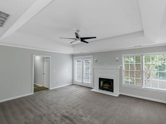 The inviting living room boasts trey ceilings, a cozy fireplace, and French doors that open to a large backyard perfect for relaxing or entertaining guests. Enjoy gatherings in the formal dining room, highlighted by a large window and elegant light fixture, or cook in the bright eat-in kitchen with white cabinets, plenty of storage, a tiled backsplash, and a charming window overlooking the front yard.