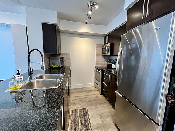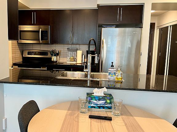 Step into this stunning 1-bedroom condo where style meets comfort. The inviting open-concept floor plan is bathed in natural light and enhanced by soaring high ceilings, creating a bright and airy living space you'll love coming home to. Beyond the main living area, enjoy the versatility of a private den with elegant French door access perfect as a home office, bedroom (it's a nursery today), or guest space. This rare find boasts modern, carpet-free flooring throughout, offering both easy maintenance and a sleek, contemporary feel. The unit has been meticulously maintained, reflecting a level of care and cleanliness that makes it truly move-in ready. Adding to the value, this home comes with a coveted parking spot and a secure locker (lockers are very hard to come by in this building), making city living as convenient as it is stylish. Whether you're a first-time buyer, downsizer, or investor, this condo offers the perfect combination of function, beauty, and practicality.