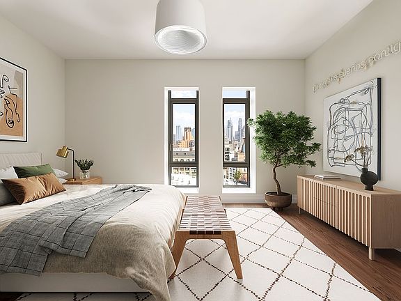 The corner primary bedroom features a double-exposure with both Northern and Eastern city views. The spa-like en-suite bathroom features elegant marble floors, walls, and countertops and is equipped with a luxurious steam shower, deep soaking tub and radiant floor heating.