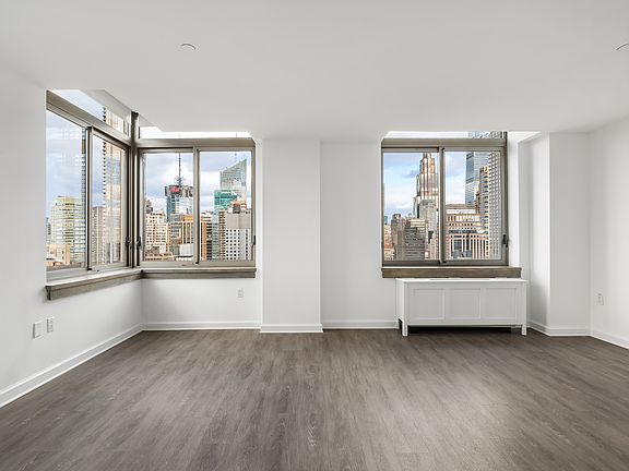 The building features a 24-hour concierge, a roof terrace, a roof deck, a communal workspace, a gym, and a laundry room. Located steps from the PATH Train, the 34th St Subway, Macy's, Penn Station, and Herald Square.
