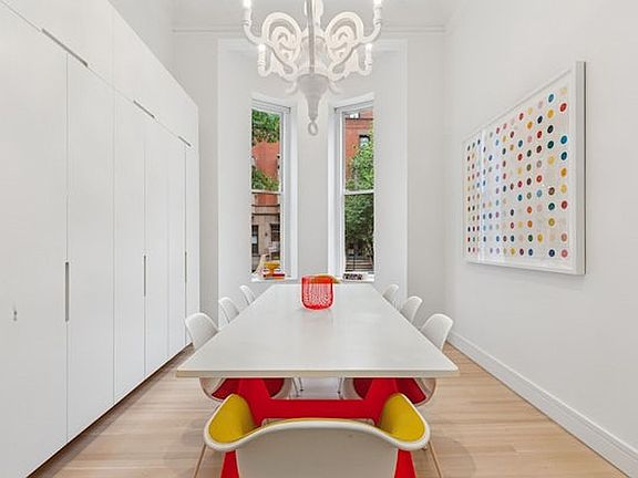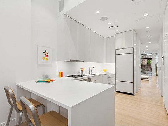 The parlor-level entry sets the tone with custom coat and shoe storage designed for both elegance and practicality. To the left, a sleek chef's kitchen gleams with top-of-the-line Miele, Wolf, and Sub-Zero appliances, complemented by a convenient seated bar top for casual dining or conversation. The generously proportioned dining room boasts soaring 12.6-foot ceilings and is framed by dramatic 9-foot curved glass bay windows, flooding the space with southern light and offering picturesque views over West 71st Street. Comfortably accommodating eight guests, making it ideal for both intimate dinners and larger gatherings. To the right, the expansive living room is bathed in northern light through dramatic floor-to-ceiling windows and enhanced by custom built-ins and lofty 11-foot ceilings, creating an atmosphere of airiness and grandeur. This level also includes a sunlit home office and a full bathroom appointed with Dornbracht fixtures and a wall-hung toilet. Overlooking the private garden, a balcony offers a tranquil retreat, while a