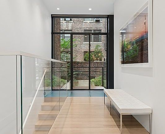 striking frosted-glass floor dramatically reveals the floating staircase that descends to the garden level below.