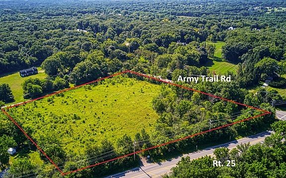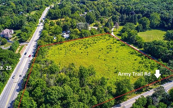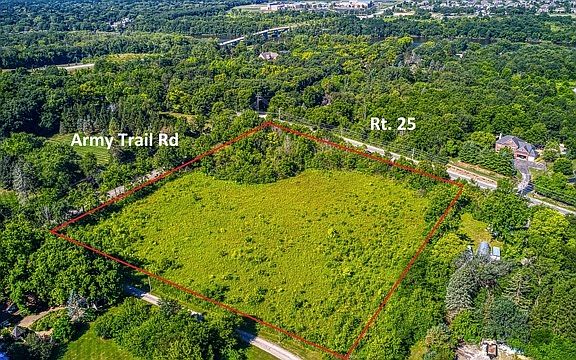 **Army Trail Road** unincorporated 4.83 acres on the northeast corner of Army Trail Rd and Rt. 25, just north of Red Gate Bridge. 540 feet of frontage on ATR and 445 feet on Rt. 25. The parcel is lightly wooded with the land's high point midway on the Rt. 25 line. The parcel gently slopes down to east and is rolling. This is a terrific single estate lot, or could be split into to two building sites. Check with Kane County planning & zoning on the E-2 zoning (2.5-acre minimum lot) in Kane County. The parcel is nearby to estate homes. To access/walk the property, DO NOT park in the neighbors' drives to access the parcel. There is an "apron" into the parcel for a single car off Rt. 25, but be careful of traffic. Call LA with questions. See docs in Add'l Info.