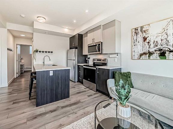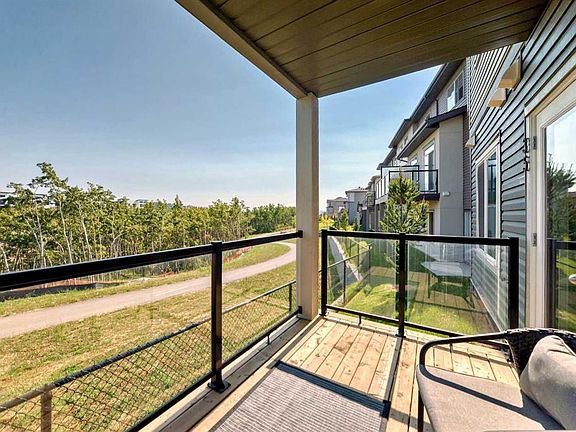 Like new 2 brdroom end unit townhouse backing onto wooded natural ravine and walking path. Really low condo fees ($149). This bright/open bungalow-style condo features a contemporary style, an abundance of natural light, large balcony, 9' ceilings, quartz counters, and breakfast bar. Plenty of storage room. Location is ideal: walking distance to stores and restaraunts and parks and playgrounds. Presigious community. Titled parking stall and visitor parking right outside your door. Well worth viewing! 35 Spring Creek Common SW.