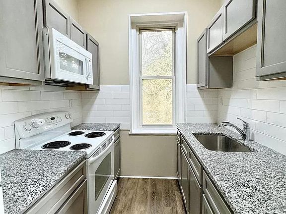 Come check out this updated apartment with high ceilings and luxury flooring that includes trash and parking! Large windows fill each room with natural light, including the formal living room, formal dining room, galley-style kitchen, 1 bedroom, and bathroom. The kitchen includes modern cabinetry and countertops, subway tile backsplash, and newer appliances. Large windows fill the rooms with lots of natural light, and the unit is located on the 2nd floor. 1 month's security deposit and first month's rent due at signing.