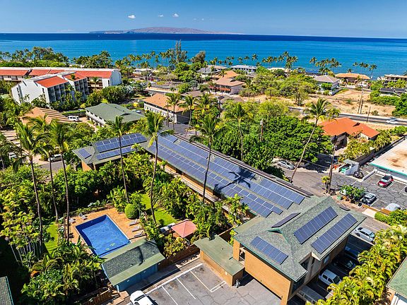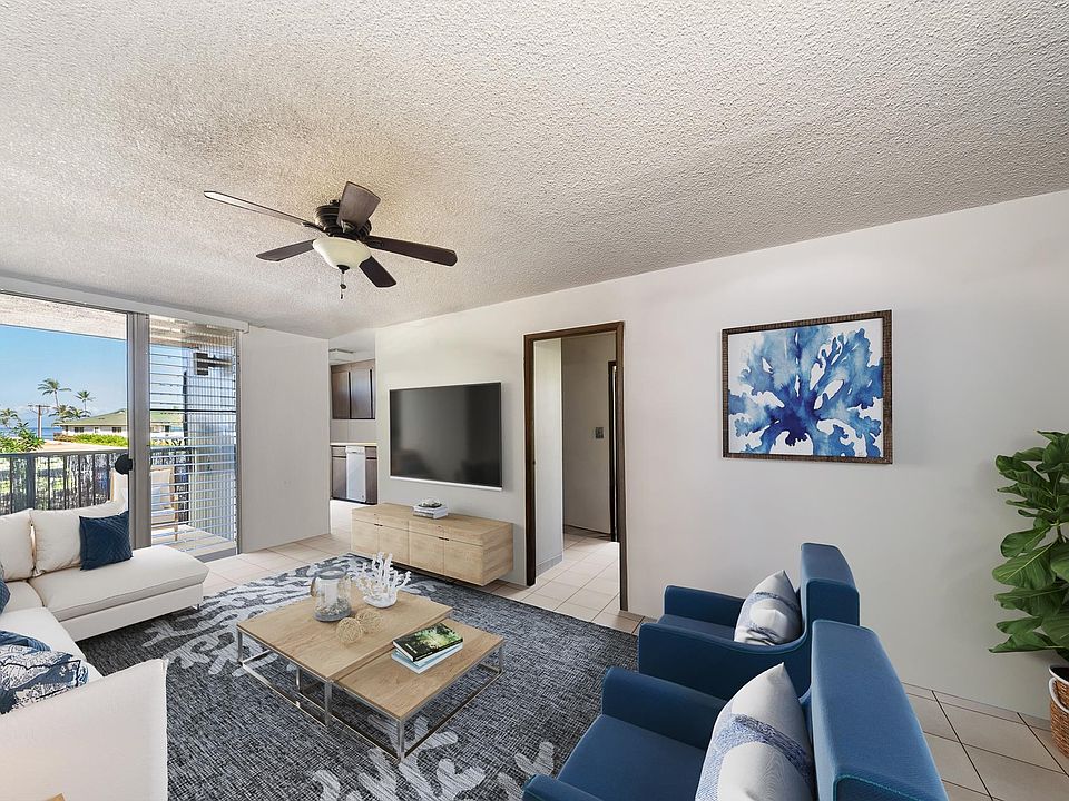 Photos are Virtually Staged* A rare opportunity at Kalama Terrace! This spacious 2 bedroom, 1 bath end-unit offers approx. 685 sq. ft. of comfortable living with extra windows that invite natural light and cooling tradewinds. Positioned on the 2nd floor directly across from the sparkling pool and BBQ area, you'll enjoy ocean views from your private lanai and the ease of corner-unit privacy. As one of only a handful of 2-bedroom residences in the complex, this condo stands out for both size and convenience. Kalama Terrace is a boutique 61-unit community in the heart of South Kihei—just a short stroll to Charley Young Beach, Kamaole I, and the Cove, where Maui locals and visitors alike swim, surf, and watch unforgettable sunsets. Shopping, dining, and grocery stores are also nearby, making everyday living effortless. The complex has recently been refreshed with exterior painting, new gutters, and an updated pool deck and BBQ area. On-site laundry and assigned parking add to the convenience, while the monthly maintenance fee includes electricity, water, sewer, trash, propane, and grounds upkeep—keeping ownership simple and stress-free. Whether you're seeking a primary home, vacation getaway, or investment property, this South Kihei gem combines location, lifestyle, and value. Rarely available, and ready for you—schedule your showing today.