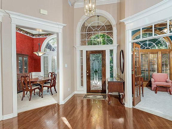 Original owners! This custom 1.5 story home is located on a quiet cul-de-sac in Alden Bridge - zoned to top rated schools and just minutes from shopping, restaurants, parks with playgrounds and miles of walking and bike trails. This light and airy home offers incredible curb appeal with an all brick exterior, double crown moulding, hardwood floors, transom windows, plantation shutters, built-ins and detailed trim work throughout. The study can be closed off for privacy with French doors and has a built-in desk with shelving. An elegant formal dining with chair rail and adjacent butler's pantry opens to the formal living room with gas log fireplace and wall of windows framing your backyard pool views. This island kitchen is the heart of the home, and opens to the breakfast and family rooms with more windows that allow natural light inside. Rare owner's retreat and two bedrooms downstairs, with a game room and 4th bedroom up; backyard oasis has lush landscaping, a timeless pool and spa.