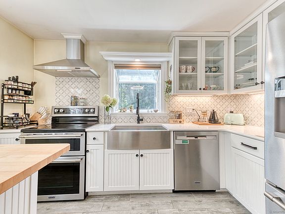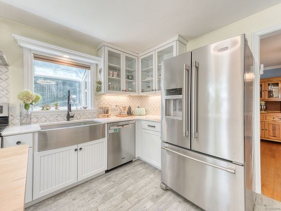 This beautifully remodeled ranch is the perfect fit! The open floor plan features a stunning custom kitchen with abundant cabinet storage, stainless steel farm sink and movable island. The spacious, light-filled living room includes a cozy fireplace with insert, built-in bookshelves, and a charming bay window. The dining room, conveniently located off the kitchen, is ideal for everything from an intimate dinner for two to hosting a larger gathering. Enjoy your morning juice or coffee or evening beverage in the sunroom overlooking the garden. Two comfortable bedrooms and a full bath complete the main level. Don't miss the beautiful hardwood floors throughout! Downstairs, you'll find even more living space-a large den or flex room, laundry area, music/media room, additional full bath, storage room, and utility space. Step outside to a backyard designed for relaxation and entertaining, with a patio and pergola perfect for gatherings, or plant your own garden and enjoy the harvest. Nestled in a quiet neighborhood with easy access to Route 8 and nearby local shopping, this home also comes equipped with efficient solar panels-say goodbye to electric bills! Come take a look and see what a great home this is! Seller to find home of choice. Field card shows only 1 full bath, there are 2, one is in the basement.