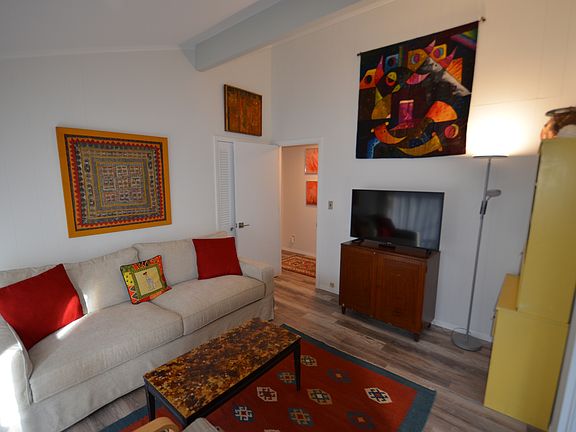 Mid-century modern houseRenovated bathroomsLarge sliding glass doorsNear the oceanCathedral ceilingsAdjoining denNew appliances