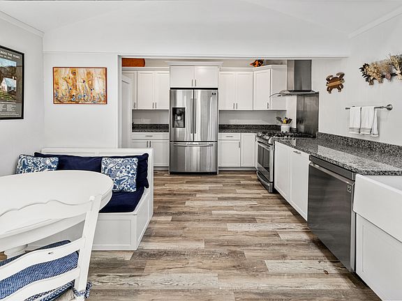 Large sliding glass doorsBrick fireplaceCathedral ceilingsCozy adjacent denOutdoor showerSunny eat in kitchen