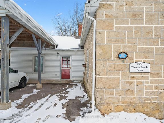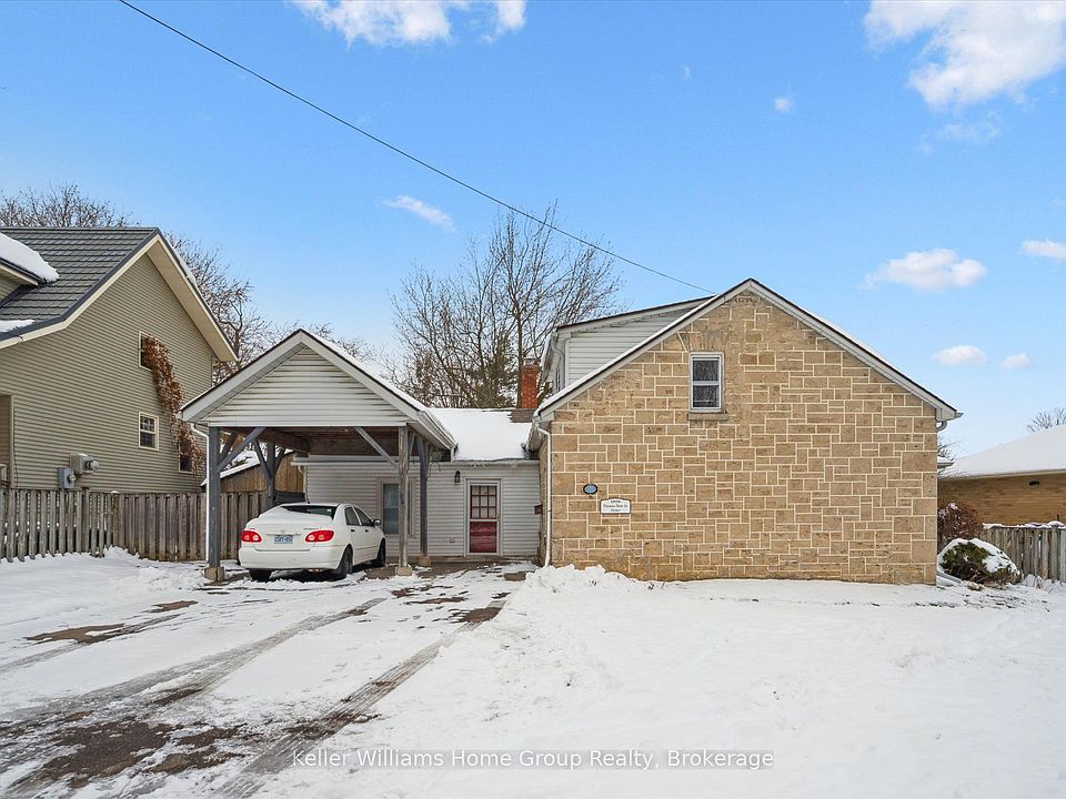 Location ! Location ! This hidden gem, built in 1856 is the original limestone homestead with added addition in more recent years, offering 1600 sq ft. of living space. Just steps to downtown Fergus, this unique opportunity has so much to offer the first-time buyer, investor or contractor alike. As you pull up, the oversized double driveway across 72' property frontage, will impress those looking for a surplus of parking and the bonus carport. Once inside, the family room addition is a nice space with built-in fireplace and walk-out to fenced rear yard. My favorite room is the large sunken country kitchen with lots of cupboard space, stainless steel appliances and eat-in dining area. Once a formal dining room off the kitchen, another large room has so many other possibilities, including primary bedroom, added family room, home office and more. Make your way to the upper level and you will find 2 generous bedrooms, both with double closets and the original wide pine plank floors and full 4 pc. bathroom. Whether you're looking to make this your first home or looking for a renovation project, this home is a rare opportunity to bring that all together. It's not often an opportunity like this comes available, schedule your viewing today !