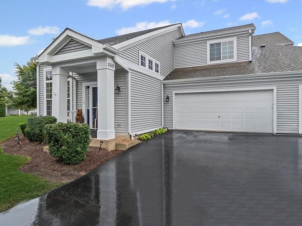 Stunning end-unit two-story townhome in the highly sought-after Winding Waters subdivision! This beautifully maintained home features 2 spacious bedrooms, 2.5 baths, and is drenched in natural sunlight throughout. The sun-filled living room boasts soaring two-story ceilings and flows seamlessly into the open-concept dining and kitchen area. Enjoy wood laminate flooring throughout the main level and a sleek, modern kitchen complete with all stainless steel appliances-including a brand-new refrigerator (2025), butcher block countertops, two-tier island with seating, updated light fixtures, accent shelving, and classic subway tile backsplash. The adjacent dining area leads out to a private patio with generous green space-perfect for relaxing or entertaining outdoors. Main level also features an updated half bath and a mudroom with extra closet space, leading to the 2-car attached garage with built-in shelving for added storage. Upstairs, the primary suite offers a custom walk-in closet and a fully remodeled private bath (2021) with a walk-in shower surround. The second bedroom also includes custom closet organizers and sits next to another updated full bath with a tub/shower combo. Full-size washer & dryer (2021) are conveniently located on the 2nd floor. Additional updates include new A/C (2022). Close to shopping, dining, golf, parks, and downtown Oswego. Don't miss this move-in ready gem-welcome home!