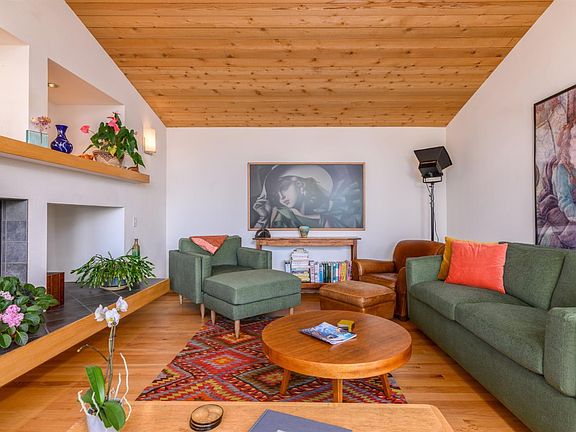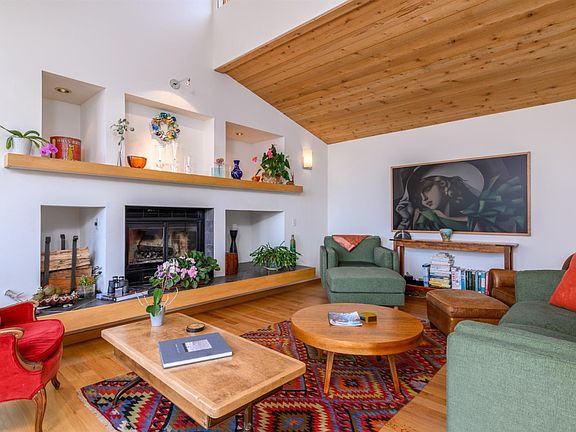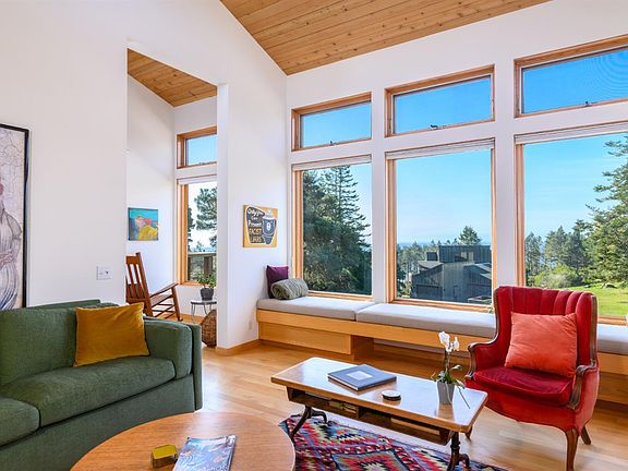 Light-filled and contemporary, this Sea Ranch home offers sweeping ocean views, privacy, and effortless indoor-outdoor living. Expansive windows throughout invite natural light to pour in, enhancing the warm wood finishes and open-beam ceilings. The home features beautiful hardwood oak flooring, a wood-burning fireplace with hearth, and a charming built-in window seat perfect for relaxing with a book or enjoying sunset views. The spacious dining area with soaring ceilings easily accommodates both formal gatherings and casual everyday meals. A family room or home office is located off the dining area. The view-oriented kitchen is thoughtfully designed with stainless steel appliances, gas range, double sink, and a breakfast bar with seating for four. A convenient half bath serves the main living areas, and a sliding glass door opens to an ocean-view deck is ideal for entertaining or morning coffee. The primary suite offers abundant light, dual vanities, a tiled walk-in shower with glass doors, and a generous walk-in closet. A private guest bedroom with built-in window seat provides a comfortable retreat, complemented by a guest bath with dual vanity and shower-over-tub. Outdoor spaces include multiple decks and a hot tub for relaxing under the stars. A detached garage with storage, partially fenced yard, and extra parking add flexibility and function. Located on a quiet cul-de-sac, the home has been thoughtfully maintained with a newly installed 50-year roof, fresh exterior staining, and 6 kw solar system with 19.8 kw of battery backup for energy efficiency. A wonderful opportunity to enjoy the best of Sea Ranch coastal living.
