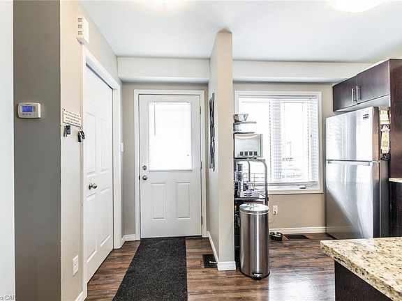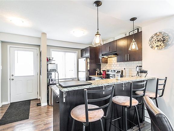 CHIC END UNIT CONDO TOWNHOUSE! This modern home is sure to impress. Fantastic kitchen with Granite counters, backsplash, breakfast bar and SS appliances. Laminate wood floors through to the dining area and bright living room with access to the deck. The 2nd floor features 2 good size bedrooms and an upgraded 4 pc bathroom. Unfinished basement offers lots of storage, laundry area and bathroom rough-in. Beautiful deck with natural gas line for your BBQ. Over looking the gazebo and park area. 1 car parking and lots of visitor parking for your guests. Great East Galt South Cambridge location close to many amenities which include shopping, schools, walking trails and so much more. Don't miss out on this one! Book your Showing today! VIRTUAL SHOWINGS TO START PLEASE! Tenant occupied. Closing is available any time May 15th or later.