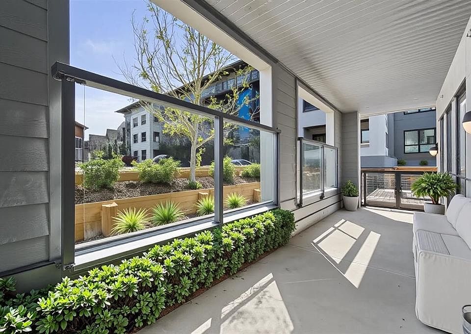Southeast-facing corner condoModern vinyl plank flooringSleek lightingIn-suite laundryVersatile denExpansive private patio
