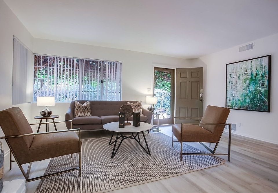 As you enter this convenient ground level designer home, you'll step into a spacious main living area with beautiful new wood floors, plush sofa bed, accent chairs, & new Samsung SMART TV. *Note, fireplace not operational.