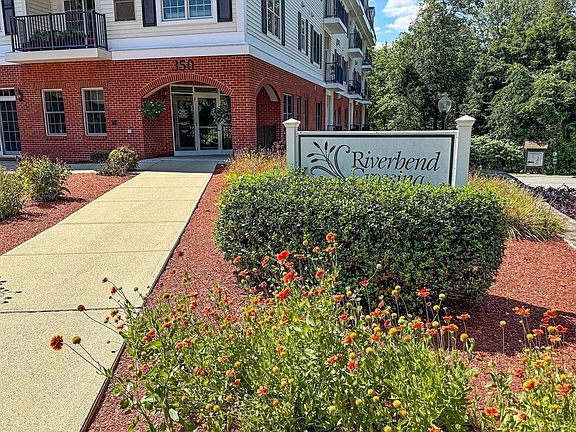 Riverbend Crossing 55+ condo community (one occupant must be 55 or older). Beautifully maintained 2 BR 2 BA corner unit on 2nd floor, offering a lot of natural light. Open floor plan features kitchen with cherry cabinets, granite countertops and breakfast bar with fireplaced (gas) living room. Enjoy the morning sun on the balcony. Upgrades include hardwood floors, tray ceilings, crown molding, in unit laundry, recessed lights and plenty of closet space. Additional storage in basement, plus a deeded parking space in carport. Common areas include a fireplaced lobby/sitting area and library area, a skylit reading/sitting area on the first floor, and common activity room with kitchen available for individual functions. Updated/newer appliances include heating/air conditioning unit (2024). Hike in your backyard on the Shawsheen River Trail.