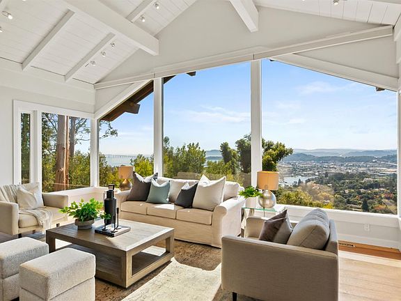 Nestled in the exclusive San Rafael Country Club neighborhood, this beautifully crafted 4-bedroom, 3-bathroom home rests on over 3 acres of natural landscape, offering privacy, sweeping views, and exceptional indoor-outdoor living. Take in breathtaking vistas of Mt. Tamalpais, San Pablo Bay, Loch Lomond Marina, and distant glimpses of the Bay and Richmond-San Rafael Bridges. The open, flowing floorplan is accented with vaulted ceilings centered around an inviting living room with stunning views, and a beautifully remodeled kitchen opening to an expansive deck creating a seamless transition to outdoor spaces ideal for relaxing and entertaining. The main-level primary suite also features vaulted ceilings and its own private deck with peaceful outlooks taking in the glowing sunsets. Downstairs, three additional bedrooms and a cozy family room provide flexibility for guests, work, or play. A detached two-car garage includes a versatile studio above, ideal for a home office, exercise room or potential ADU. Enjoy resort-style living with a sparkling pool, outdoor kitchen, and tranquil natural surroundings. Conveniently located near Andy's Market, Whole Foods and Montecito Plaza, and just minutes from the trails and coastal beauty of China Camp State Park and only 10 minutes to 101!