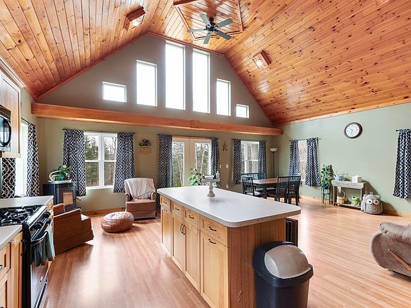Welcome to your very own North East Kingdom Retreat! This property sits on 10.4 acres, offering a private and peaceful setting with a lovely 3 bedroom, two-bath home and spacious garage. You are welcomed into the open-concept living area and greated with a beautiful cathedral ceiling and plenty of natural light making it a warm and inviting space. The home has radiant heat on both the main and basement levels with a pellet stove for added warmth. The kitchen offers a large island with an oversized top allowing seating on one side, ample cabinet and counter space and a full suite of appliances. On the main level are two bedrooms, a full bath, and a laundry area. On the second level you will find a loft and the primary en-suite, which boasts a walk-in closet and a full bathroom featuring a relaxing soaking tub. The basement has a fantastic finished family room with a large bar and surround-sound speakers, the perfect spot for hosting a fun get-together or relaxing with the family and watching a movie. There is also a large storage area for all the extras. Outside is a spacious yard with plenty of room to garden or enjoy outside activities. A 2-bay garage has 10'x10' garage doors and a second level that provides ample storage for your belongings. Whether you're searching for a vacation escape or a forever home, this property has it all. Take advantage of the chance to see it for yourself! Schedule a visit today and fall in love with this welcoming retreat.