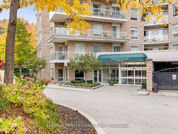 DIRECTLY ON THE RAVINE! Muskoka in the city corner unit!! Desirable Chestnut Park building. Stunningly elegant andspacious condo with split bedroom plan in much desired building. Huge wrap-around balcony gives you wonderful views of theravine. Listen to the birds and watch the seasons come and go. Quiet unit with large principal rooms and great flow. Privacywith split plan and each bedroom having their own bathroom!! Remote controlled window blinds in bedrooms. Great unit toshare with family/friends. Updated kitchen with new Bosch dishwasher (2025). New and accessible tiled shower (2025) inprimary bedroom ensuite bath. Large walk-in closet with organizers. Miele washer/dryer in ensuite laundry. Huge living/dininggreat for entertaining with walk-out to wrap around balcony. Window in the kitchen (rare for condos!) lets you enjoy the view.Walk up Mill Rd. to Centennial Park and beyond! Very easy access to transportation - Hwys 427, 401, Gardiner Expw; 2 minwalk to bus. Centennial Park public Golf Course walking distance away. Loblaws, Longos, Shoppers Drug, LCBO also a shortwalk away. Sherway Gdns, Cloverdale Mall, Square One, a short car ride. Property Mgt office on-site. One owned parking spotand locker. Plastic storage bench and stacking chairs on balcony can be left. Support bars on toilet can be removed beforeclosing. Visitor parking spots outside bldg entrance and underground. Indoor pool, party room, gym, 2 guest suites. On siteproperty mgt office.