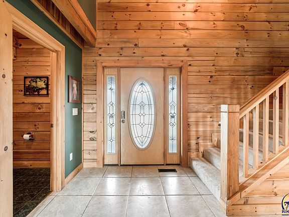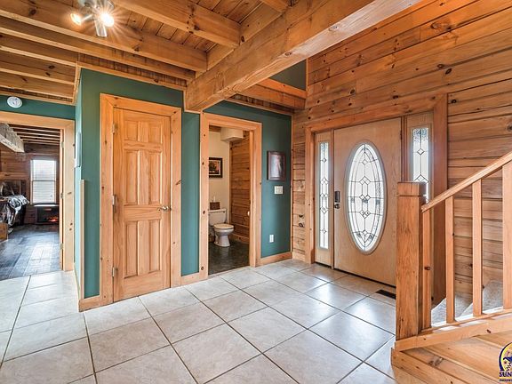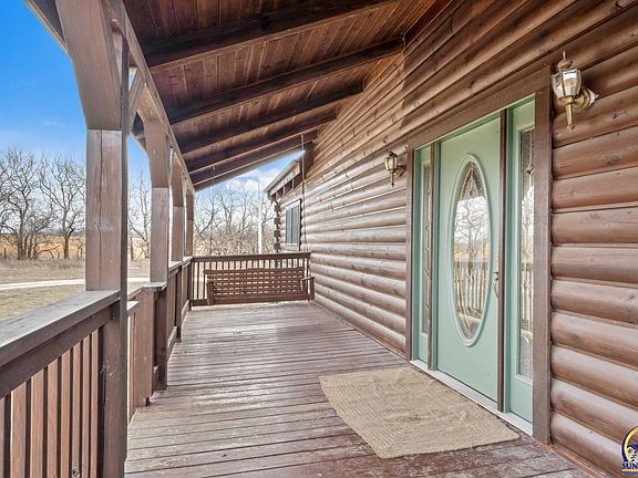 Escape to the country to your dream of owning an authentic log home tucked deep off the road situated on 20 secluded acres. A long driveway takes you past a stocked pond & frequent wildlife sightings of all sorts. Fall in love at first sight when you lay eyes on the wall of south facing windows from the great room, offering breathtaking views of pure tranquility directly across from a gas fireplace with floor to ceiling chimney, just as you'd expect from a home of this caliber. You'll be greeted w/ warm oak cabinets, Corian countertops, built in oven, flat cooktop and sprawling island as you step into a kitchen which is sure to delight any chef. A set of double doors takes you from the formal dining room onto a sprawling deck for the perfect place to unwind while take in the sounds of nothing but nature. You can also access the deck from the main floor primary bedroom w/ private bath offering a soaking tub & walk-in shower. The cat-walk loft with sitting area, has a large bedroom at each end plus a full bathroom in-between. A fourth non-conforming bedroom is available in the walkout basement next to a rec room that will provide extra space for your favorite activities. There is a 60 X 20 outbuilding designed for livestock use w/ a raiser floor section which would make for dry hay storage, feed room or tack area. Perimeter of property is fenced. Well water. 25 min. to Lawrence & 42 min. to Topeka. Turn your wish into reality! call to schedule before this one gets away!