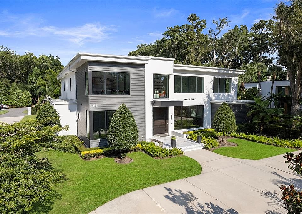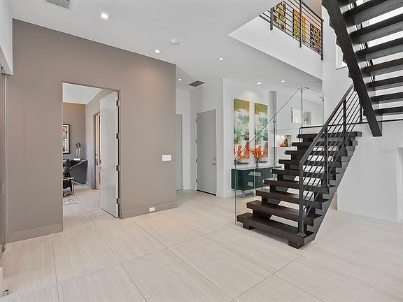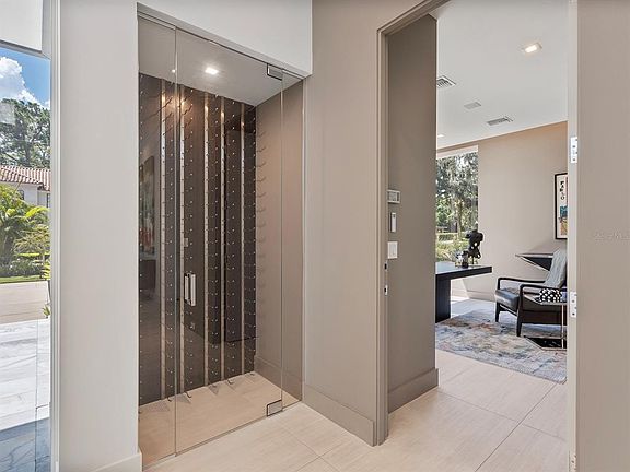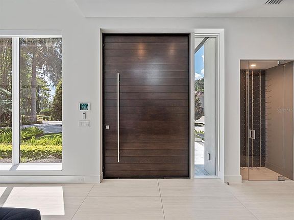 Private setting within the exclusive Lake Maitland Owl Preserve, this spectacular five-bedroom contemporary residence was masterfully built in 2019 by award-winning E2 Homes. A dramatic 12-foot-tall wooden pivot-door makes a striking first impression, opening into a light-filled foyer, gathering, dining, and kitchen wide-open everyday living area with soaring two-story ceilings. A floating staircase becomes an architectural centerpiece, while a sleek linear gas fireplace framed in modern stone design, anchors the living room. Flowing seamlessly into the dining area and chef’s kitchen, the home is designed for both comfort and elevated entertaining. The kitchen is a contemporary showcase, boasting top-of-the-line Wolf and Sub-Zero appliances, a hidden walk-in pantry, and an extraordinary backlit marble feature wall that serves as art and function. Disappearing glass sliders, operated remotely, blur the lines between indoors and out, extending the living space to a covered lanai with multiple sitting and dining areas, a full summer kitchen, and automated screens that protect from sun, rain and the elements. Beyond, a contemporary saltwater pool and spa with water features is framed by a sweeping lawn and thoughtfully designed herb garden with raised beds. The first-floor primary suite offers a serene retreat with a custom walk-in closet and spa-inspired bath featuring a striking tub/shower combination wet room. Also on the main level is a fifth bedroom used as a home office, complete with an en-suite bath. Upstairs living areas include a flexible loft/lounge area at the top of the stairs and leading to two flanked secondary bedrooms, and a fourth junior suite with spacious bath/walk-in closet, then anchored with access to a spacious outdoor balcony overlooking the pool and grounds. Additional highlights include beautiful porcelain tile and elegant dark wood flooring throughout, a three-car side-entry garage, and a circular drive. Secluded, but ideally located, the home offers a tranquil, preserve setting while remaining just minutes from Park Avenue’s fine shops and dining, Maitland’s cultural corridor and with convenient access to top-rated schools, downtown Orlando, and the International and Executive airports.