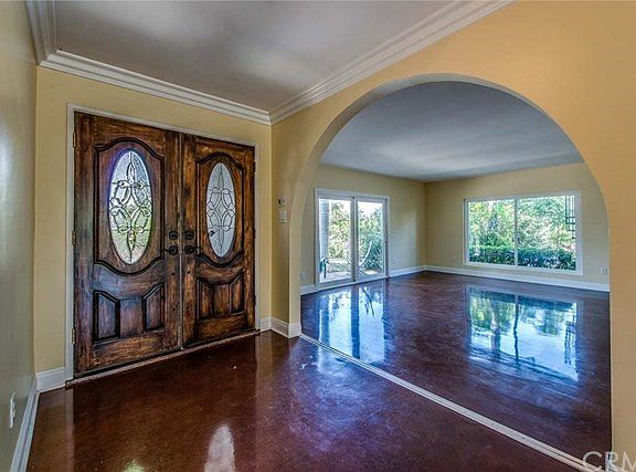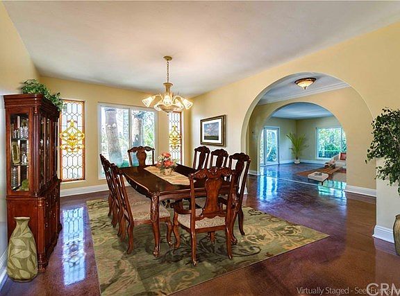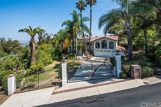 Located on a private cul-de-sac street amid rolling hills and abundant trees in an exclusive neighborhood of multi-million dollar homes in Anaheim Hills, this amazing custom residence sits on over 1/2 acre of sprawling gated grounds. Vast outdoor living space features a pool, spa, patio, extended view deck, fire pit and fruit trees with great potential to add lower level gardens or sports court. The property features five spacious bedrooms and 4.5 baths, including an expansive master suite. An additional downstairs master bedroom and bath is perfect for multi-generational families. Modern high gloss polymer stained concrete flooring on the main floor gives the illusion of smooth wood. The gourmet kitchen boasts granite countertops, white cabinets and opens to the family room with a cozy fireplace and convenient wet bar. Additional living spaces include formal living and dining rooms, breakfast nook and indoor laundry room. Enjoy dual pane windows, upgraded baths, oversized baseboards, recessed lighting and plenty of storage. For the auto-collector or RV enthusiast there is a three car garage with epoxy floors and gated parking for up to nine cars, an RV or boat.