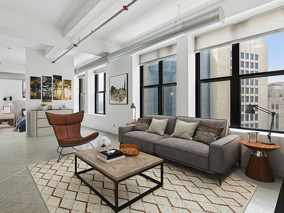Live stylishly in this 9th-floor condo at The Lowry, an iconic 1896 St. Paul landmark reimagined for modern urban living. Surrounded by 9-foot industrial-style windows, this 883 sq ft unit is bathed in natural light and offers a sliver view of the Mississippi River.