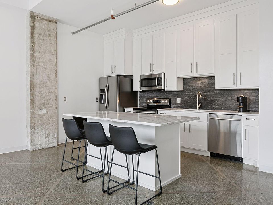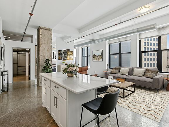 With soaring 13-foot ceilings and raw concrete columns, the space blends historic character with modern design. The sleek kitchen features newer appliances, white custom cabinetry, and a quartz-topped center island—perfect for entertaining or quiet mornings at home.
