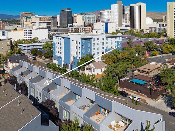 Modern three-level townhouse adjacent to Downtown Reno! This 2-bed, 2-bath home features a versatile third-story loft, a spacious rooftop deck with sweeping views, and an additional front deck perfect for enjoying Aces Ballpark fireworks and city lights. Highlights include tall ceilings, oversized windows for abundant natural light, direct-access garage plus driveway parking, and a fenced common area with pet stations and sitting spaces. Freshly painted and carpeted. Walk to some of Reno's best dining, nightlife, and entertainment right outside your door.