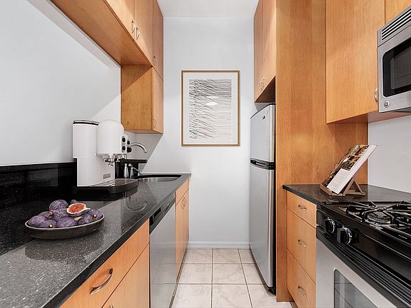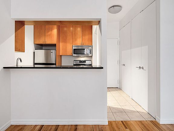 The pass through kitchen is appointed with a suite of stainless steel appliances, dishwasher, granite countertops, and cabinets that extend to the ceiling. A breakfast bar creates the perfect ambiance for casual entertaining. The pin-drop quiet bedroom is a serene oasis and can easily fit a queen sized bed. The bathroom features classic white subway tiles, a soaking tub, and a 3 panel medicine cabinet for all your storage needs.