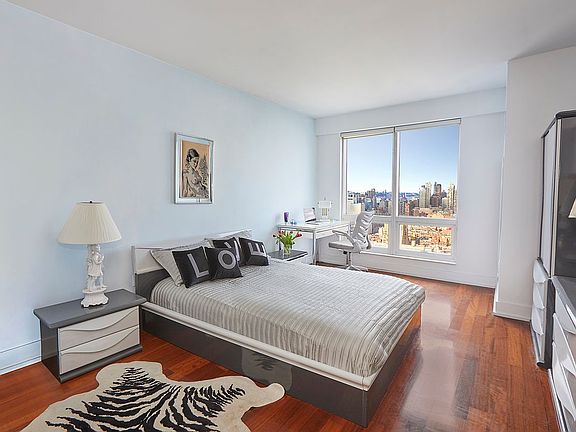 Welcome to unit 48C at 350 West 42nd Street, where elevated living meets breathtaking views in the heart of a vibrant locale. Situated on the 48th floor of a stunning high-rise post-war condo, this immaculate 1,076 sq ft home offers unparalleled vistas of city lights, majestic bridges, serene rivers, and lush parks, all from the comfort of your living room. Bathed in excellent natural light, the space boasts impressive 9-foot high ceilings, adding an airy and open feel to its Solo-level layout. Step inside to discover a beautifully designed residence featuring two bedrooms and two bathrooms. The living room glows with warmth from the rich hardwood and parquet floors. With North and West exposures, you'll enjoy dazzling sunsets from your oversized, insulated windows complete with skylights and screens. Storage is a breeze with ample closet space, and a convenient washer/dryer setup is tucked into the unit for added ease. Culinary enthusiasts will delight in the modern kitchen, equipped with new appliances and a conventional open design - ideal space for those who love to cook and entertain. The kitchen features a handy pantry, dishwasher, and dual sinks in the en suite bathrooms, adorned with marble and an oversized tub for those relaxing evenings in. The building itself leaves nothing to desire, with full-time concierge service and a business center to accommodate your busy lifestyle. For leisure, multiple terraces provides a relaxing escape, while a community playroom