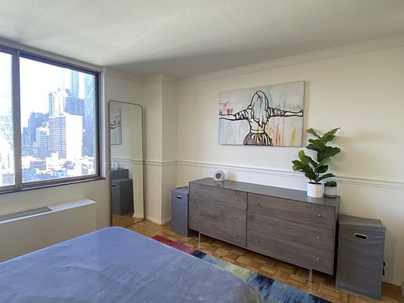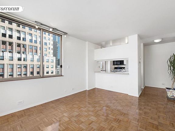 Residence 18i at 350 West 5oth Street is a sunny corner one bedroom with spectacular unobstructed North-East views of the Manhattan skyline. Available November 1st 2025. The windowed pass-through kitchen has been completely renovated. The apartment features renovated bathroom, parquet floors and excellent ample closet space throughout the home. The bedroom is spacious and will easily accommodate a king size bed. The building has a live in Resident Manager and the amenities include 24 hour Concierge, doorman, eight laundry rooms, four roof decks with beautiful open views and outdoor furniture, courtyard with tables and benches. David Barton's 40,000 sq ft. gym TMPL with the latest technology, saltwater pool and sauna is connected to the building. Monthly and annual memberships available. The Residences at Worldwide Plaza is a full service condominium ideally located in the heart of the vibrant Manhattan's theater district and the Midtown Financial District, close to Central Park, Lincoln Center, the Hudson River Park, Rockefeller Center, Radio City Music Hall, numerous restaurants, museums and points of interest. The garage on the premises is available to residents for a nominal fee. Minutes to the C, E, 1, W, N, R, B, D, F and M subway lines and cross-town buses. No Fee. Upfront fees to the Landlord are the first month's rent and the security deposit equivalent to one month's rent. Once the lease has been signed, the condo e-application fees are as follows: Application Processing Fee $700. Background & Credit Check Fee $75 per person on the Lease. Digital Submission Fee $65. Move-in/Elevator Usage $500. App Admin Fee $63.75.