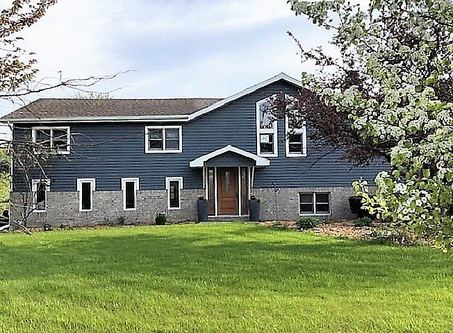 Stunning country setting. Nearly 2.5 acres with frontage on a large pond. Home features open concept on upper level. Bright, airy kitchen with island. Balcony off dining area for extended entertaining. Living room has wood burning fireplace. Three bedrooms, bath and laundry room on main level. Upper level spacious master suite, 20 x 23, with large 4 piece bath and walk-in closet. Lower level den has wood burner with insert. Owners use that as main source of heat. Work shop, family room, lavatory and walkout to yard and pond on the lower level. 2.5 car garage and 22 x 30 pole barn. Spectacular backyard. Seller has created a beach adjacent to the large pond. Great for swimming and fishing. This water is part of an extensive pond. Screened gazebo and fire pit at the waterfront.