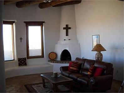 Absolutely gorgeous views from this all adobe, pueblo style home. An entire acre of land in a very private neighborhood. Architectural detail and ambiance galore. Beautiful beamed ceilings thru-out, 3 kiva fireplaces, custom Ernest Thompson cabinetry, & saltillo tile thru-out. This home oozes New Mexico charm, a must see.